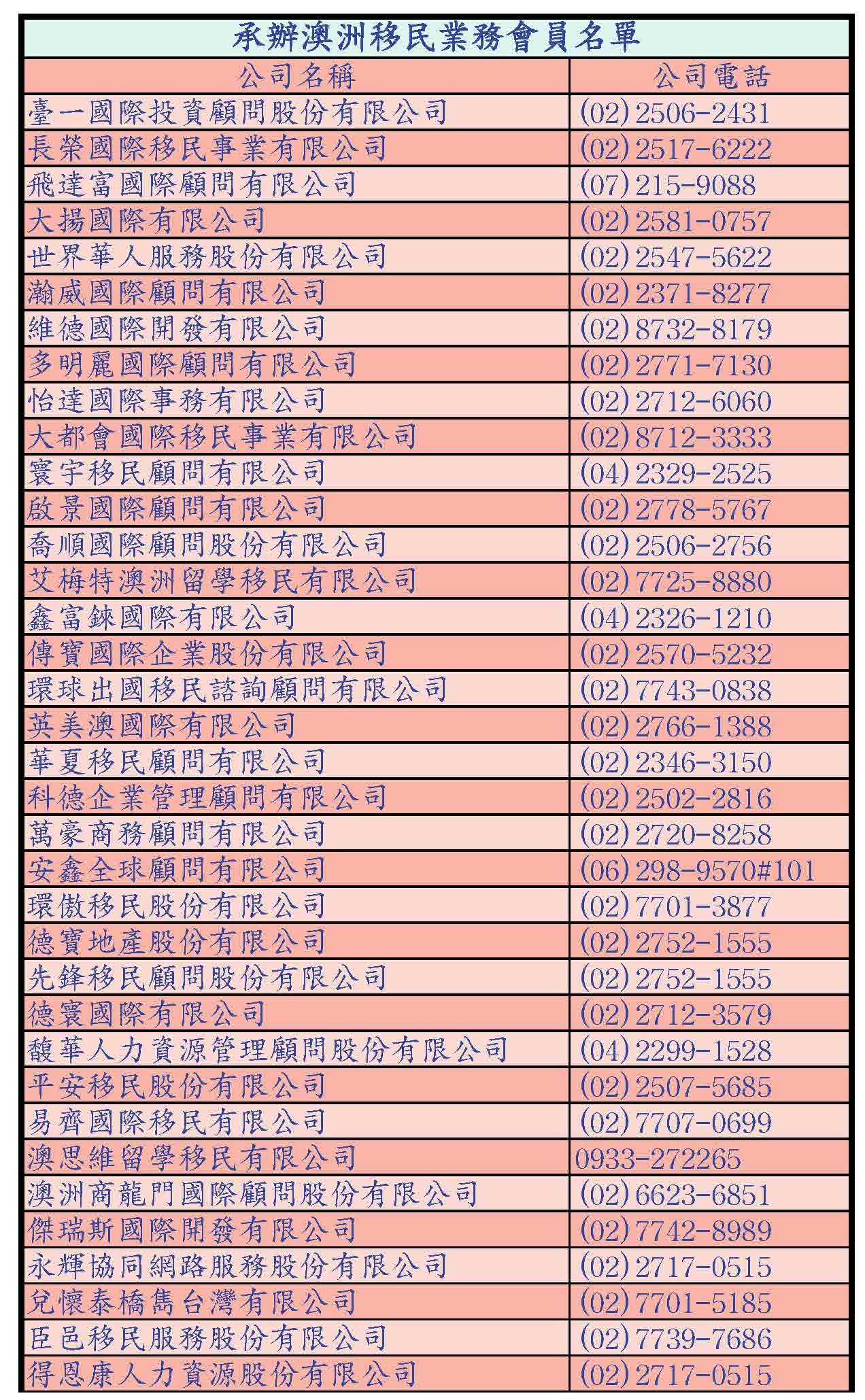 承辦澳洲移民業務會員名單