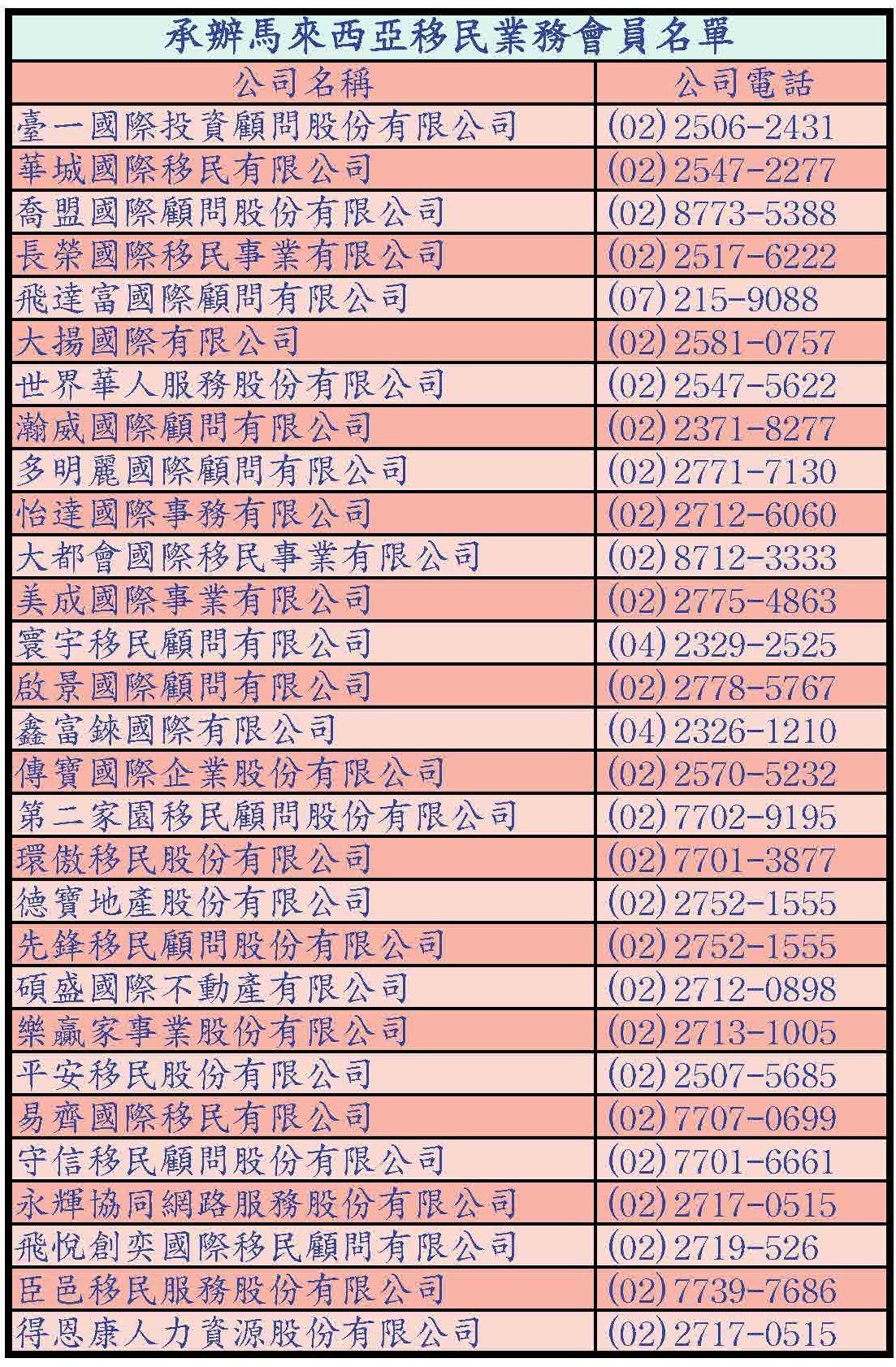 承辦馬來西亞移民業務會員名單